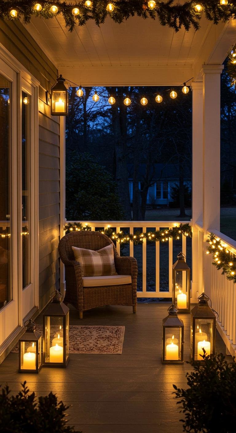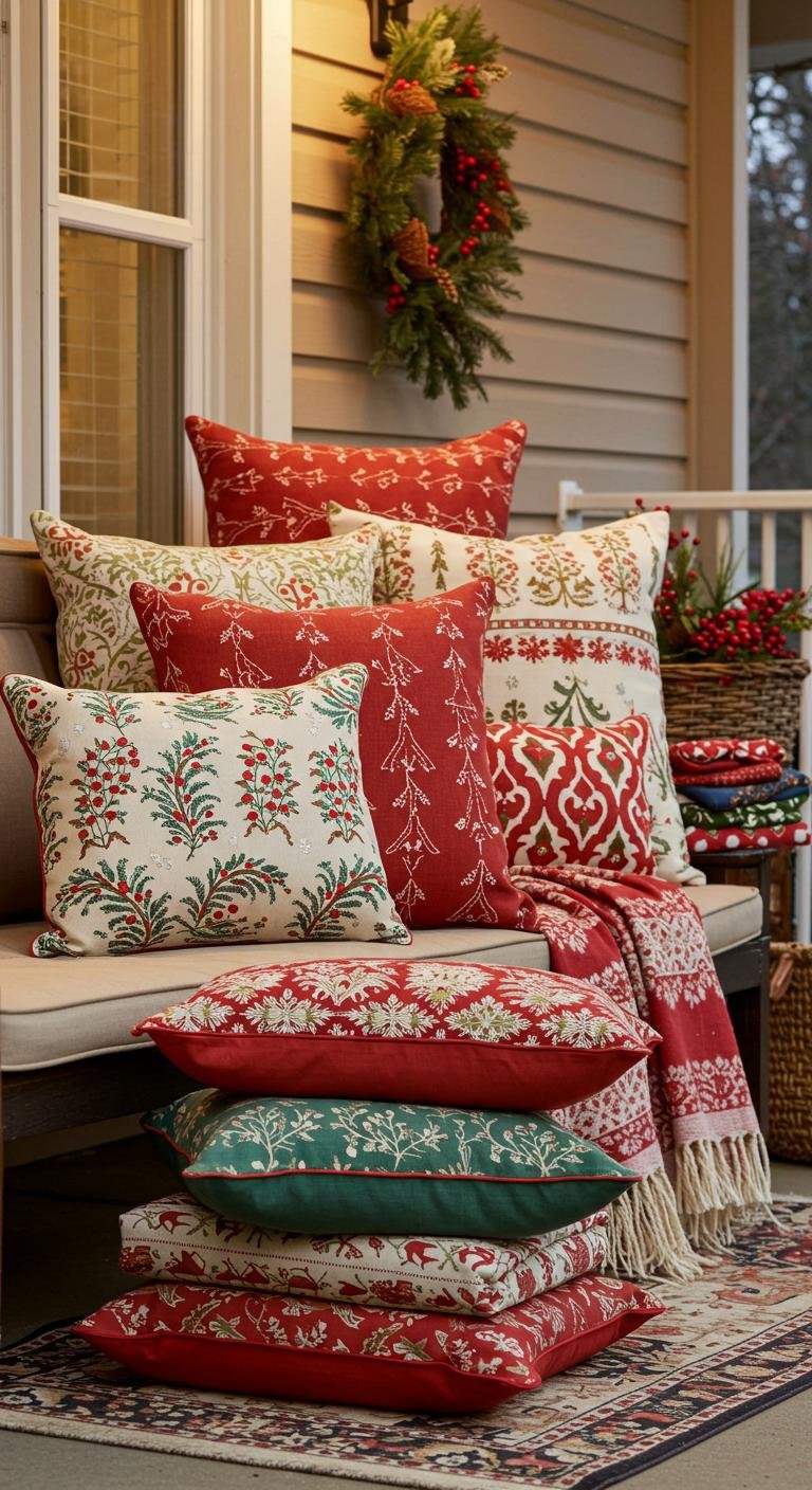 Don’t overlook the power of soft touches! Throw in some festive pillows, warm blankets, and maybe a holiday-themed doormat to that seating area. Waterproof fabrics are key if your porch isn’t totally covered, so they survive the winter weather. Matching colors and patterns will tie it all together visually, making your porch look pulled together and comfy. Plus, DIY pillow covers with holiday fabrics are a fun little project that adds major personality without a big cost.