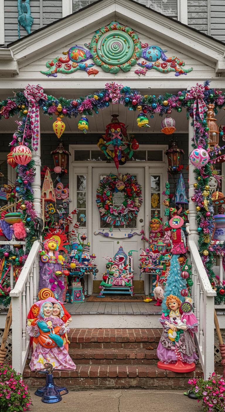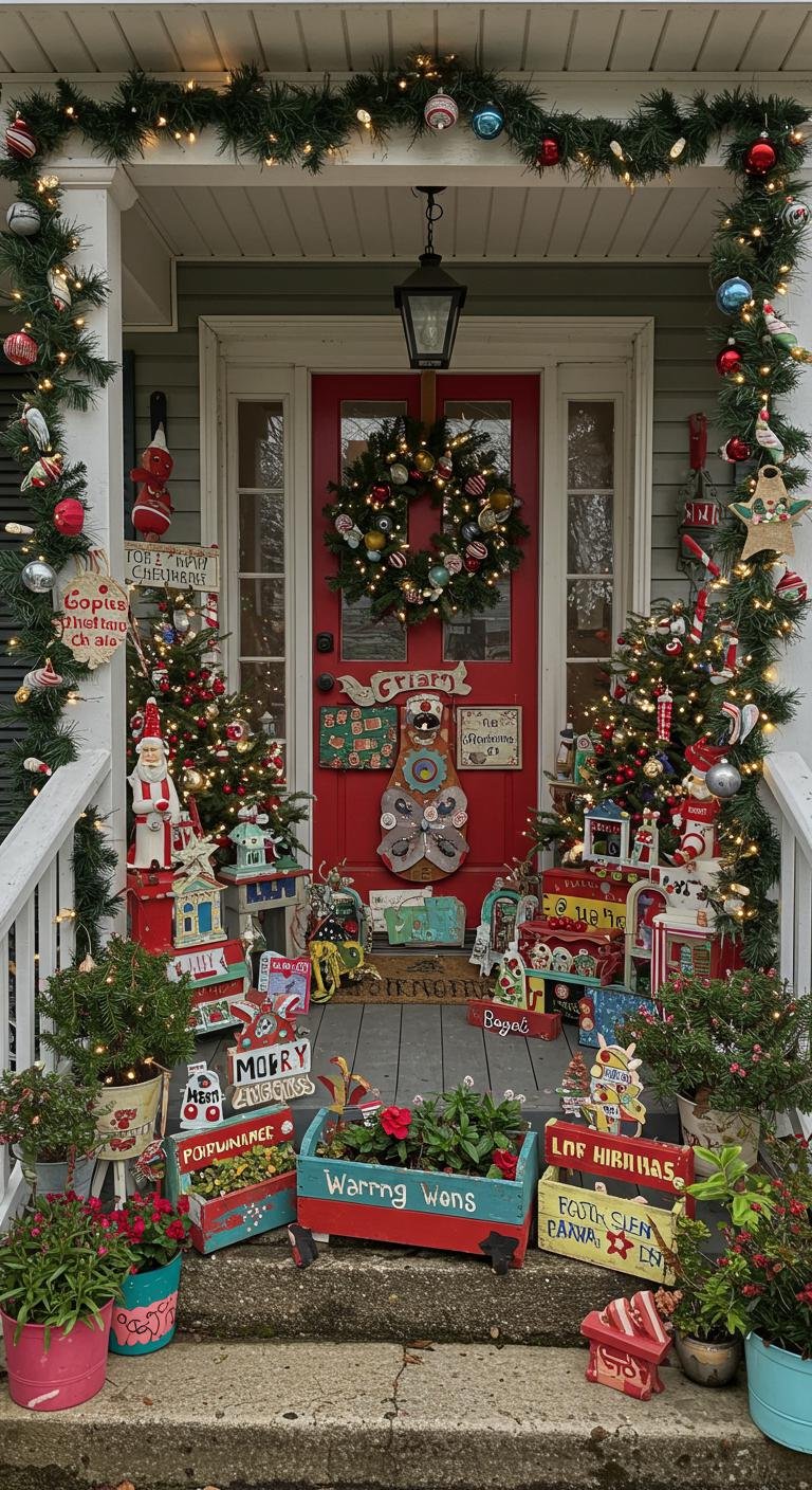 Your porch should totally feel like you, right? Mix and match playful ornaments, quirky signs, or funky finds from thrift shops with classic pieces. This eclectic style lets your creativity shine and tells a story about your unique vibe. Painting or repurposing old holiday decor can be a great way to add personalized flair without spending extra. It’s all about fun, whimsy, and making a space that feels joyful and totally yours.