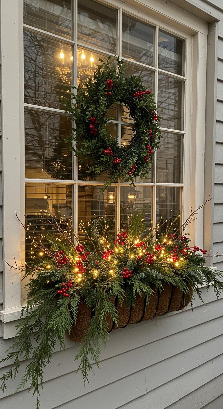 Window boxes are basically begging to get a festive makeover. Fill them with greenery, bright red berries, and wrap some twinkly lights to keep that holiday spirit going strong. I love mixing real plants with faux ones to keep the look lush without getting too expensive. Toss in a few pinecones or little ornaments for that extra cozy touch. Bonus idea: build your own window box from reclaimed wood for a personal, rustic feel — plus it’s a fun weekend project!
