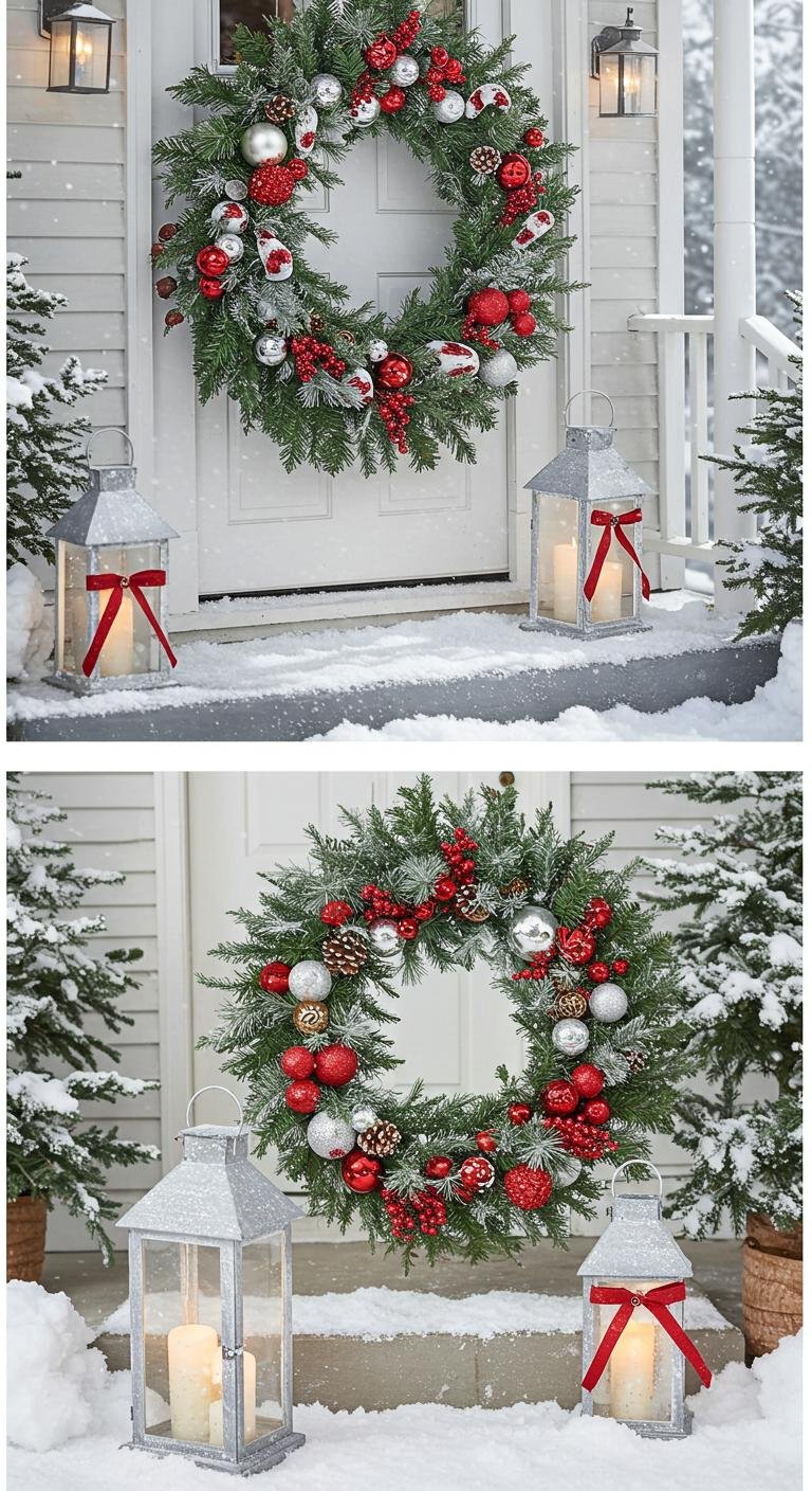 Nothing says cozy holiday like draping lush evergreen garlands over your porch railings. Adding a big, beautiful wreath on your door instantly sets that warm, festive mood. Sprinkle in some pinecones or cute little ornaments for that extra charm. And here’s a little secret: wrap some twinkle lights around the greenery to give it a magical sparkle when night falls. If you want to save a few bucks, there are some very realistic artificial greenery options that you can reuse year after year. Simple, elegant, and seriously festive!