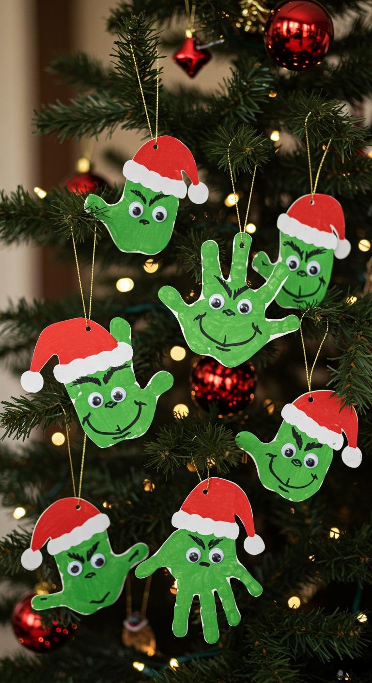 One of my favorite ways to include the kiddos in decorating? Grinch handprint ornaments. It’s super simple: grab some green paint, have each kiddo dip their hand and press it onto some cardstock, then jazz it up with googly eyes and a little red Santa hat. Not only do these make your tree totally unique, but they turn into sweet keepsakes that capture everyone’s individual touch. Plus, imagine making it a yearly thing where each person adds a new handprint—adorable and meaningful!