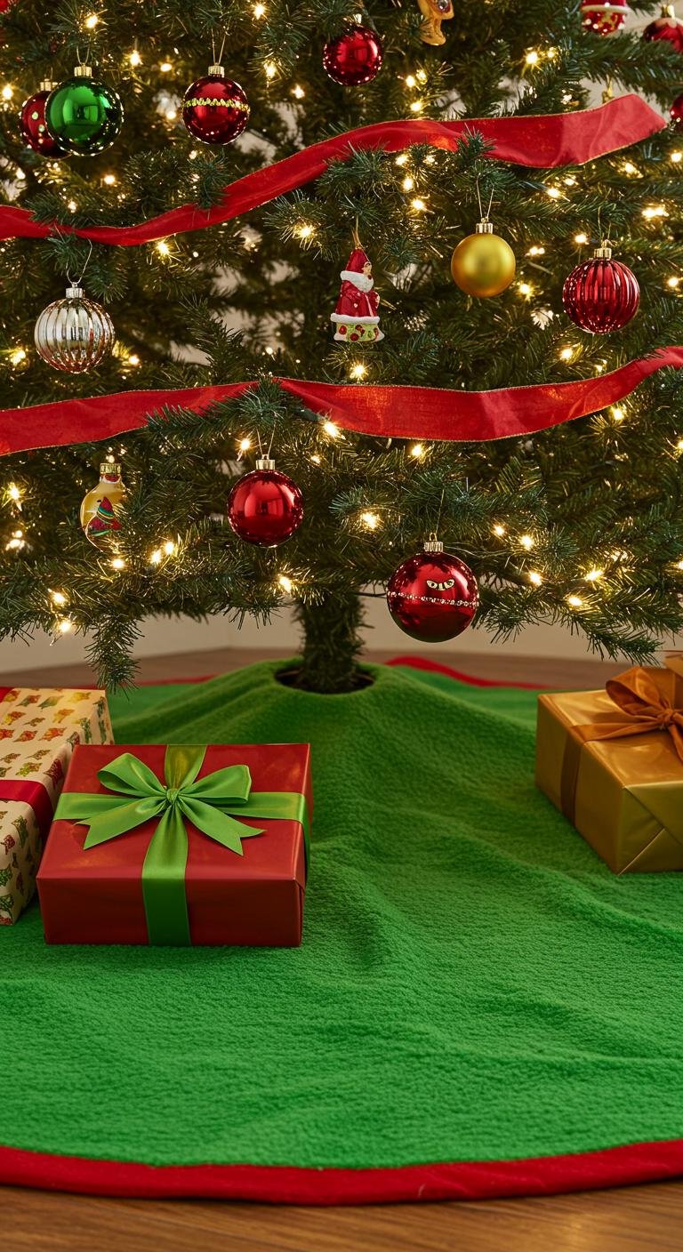 Your Grinch-themed décor isn’t complete without a matching tree skirt. Sure, you can grab one online, but making your own from green fabric trimmed with white faux fur is such a rewarding project. Feel free to go wild with adding little embellishments or Grinch faces for extra pizzazz. It’s the perfect festive foundation for all those beautifully wrapped gifts.