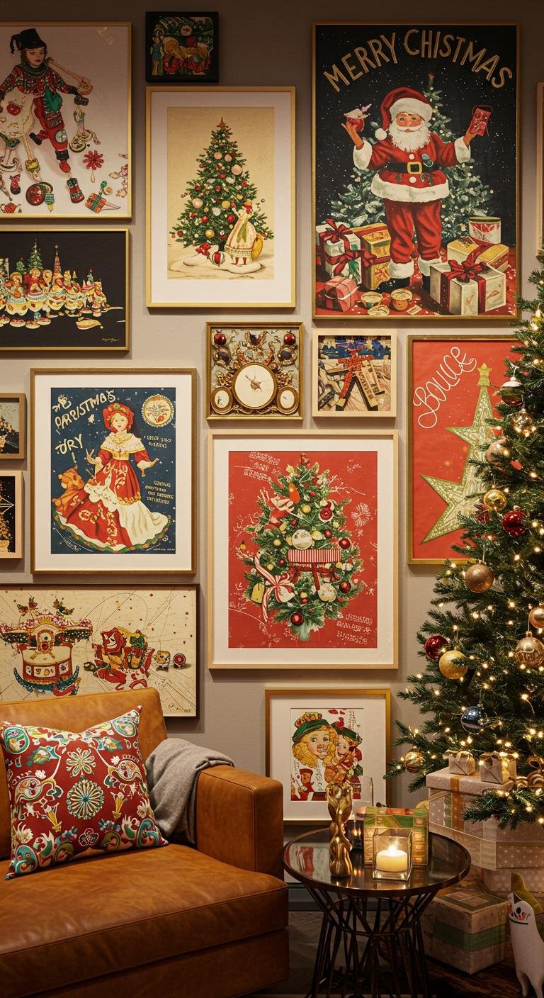 Think vibrant pieces that blend vintage holiday charm with modern art flair. Bright colors, shimmering metallics, and oversized prints can create a stunning focal point that captures attention.