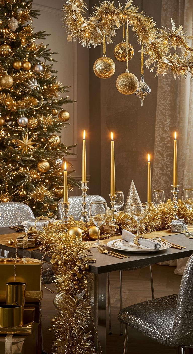 Embrace dazzling golden holiday themes by incorporating shimmering ornaments and elegant tableware.