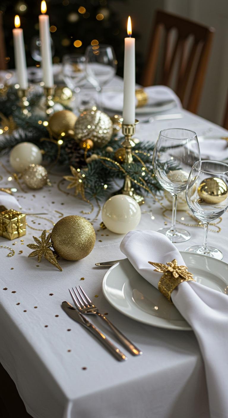 Imagine crisp white linens adorned with golden accents, sparkling ornaments, and soft candlelight.