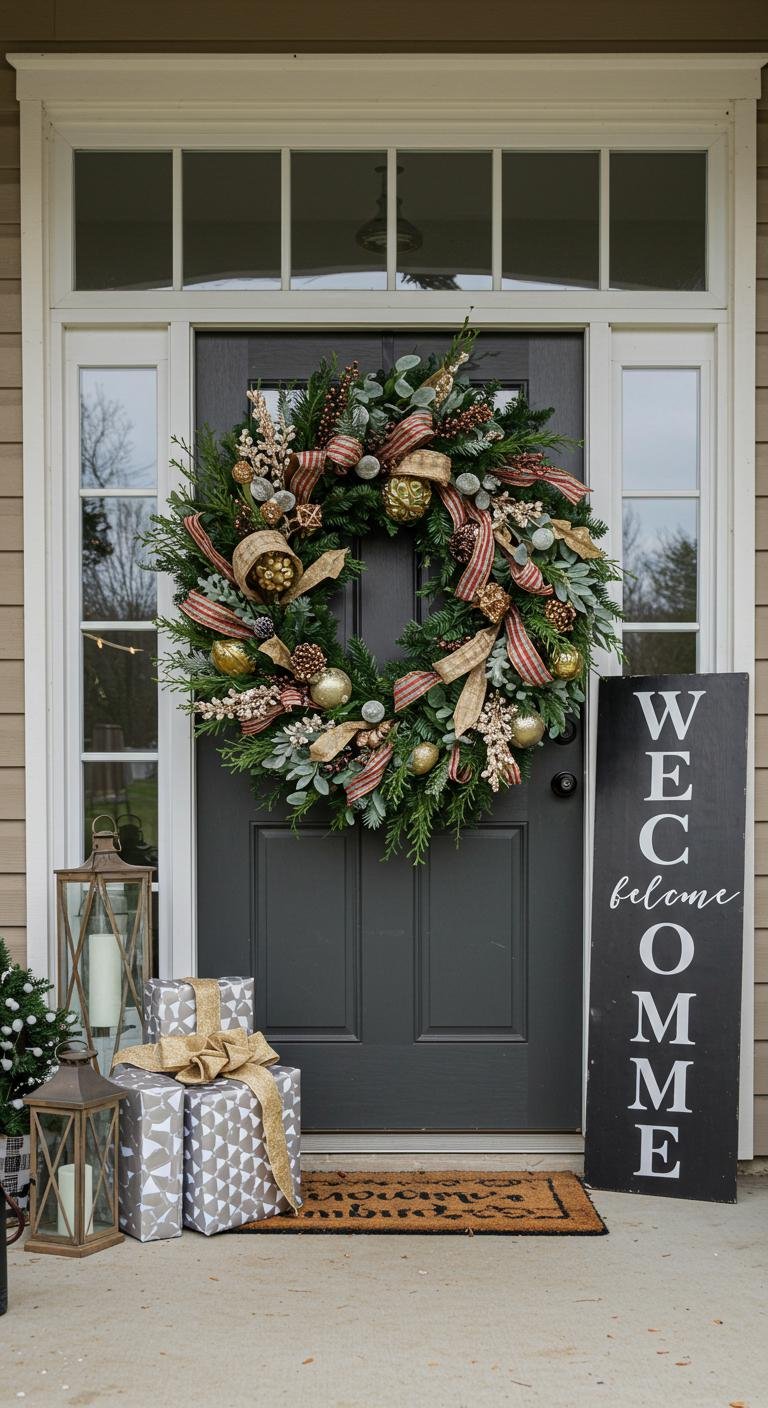 Think extravagant door wreath ideas adorned with rich ribbons and shimmering ornaments.