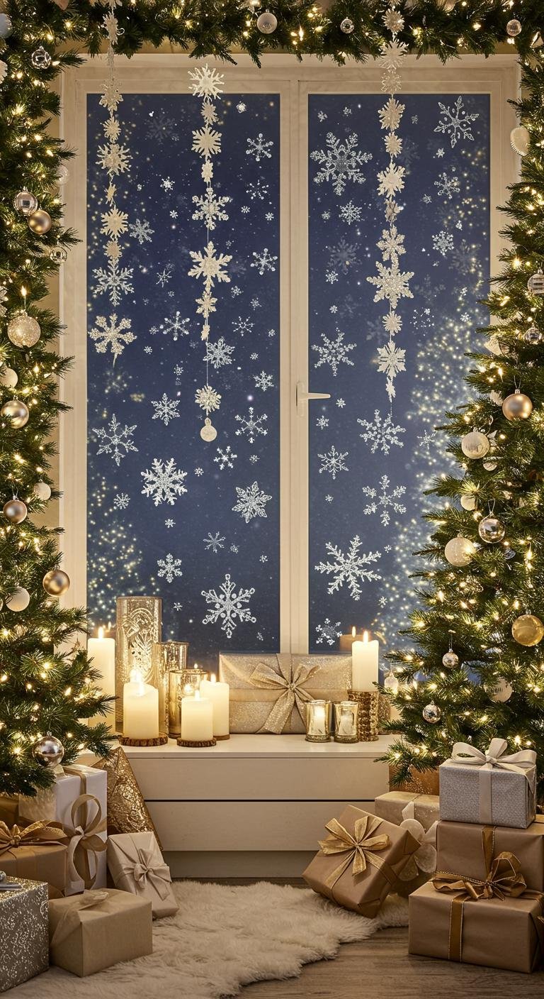 Don’t forget frosty window decals that shimmer with light, transforming ordinary glass into art.