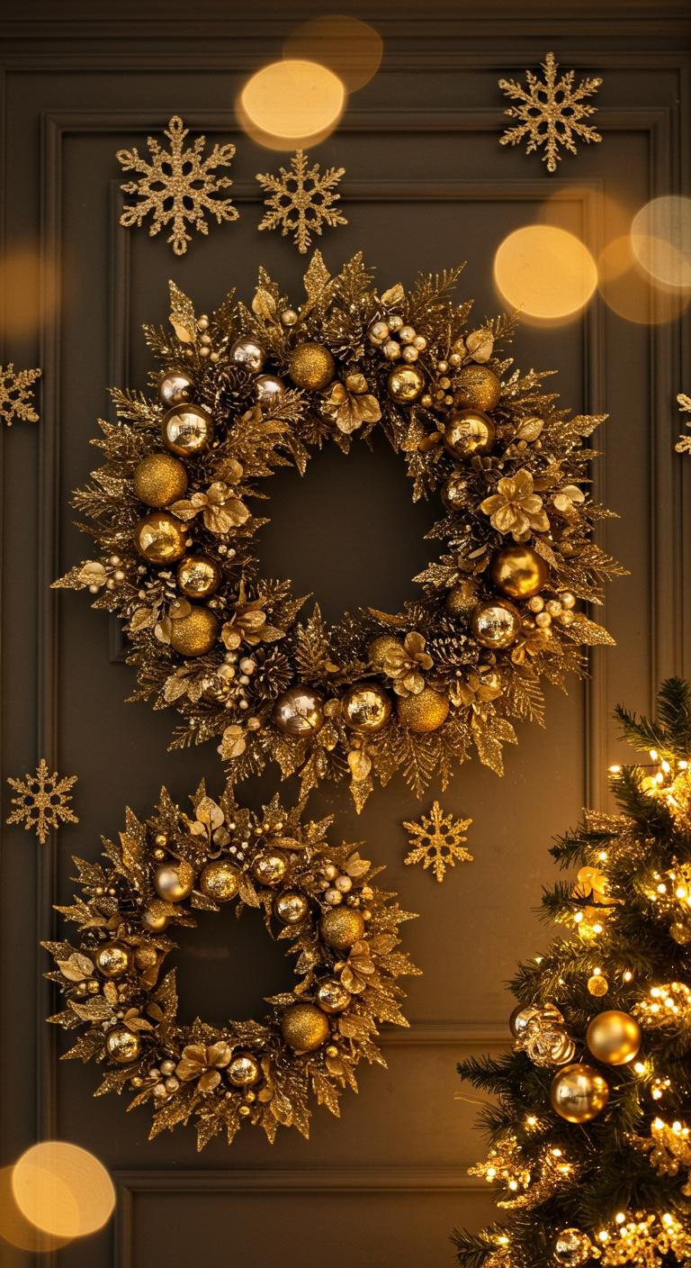 Following those beautifully whimsical snowflake accents, radiant metallic wreaths bring a striking elegance to your holiday décor.