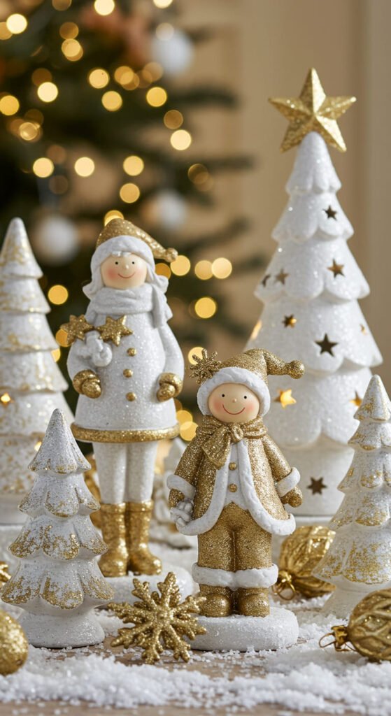 Capturing the essence of the season, white and gold Christmas figurines add a touch of whimsy and sophistication to your holiday decor.