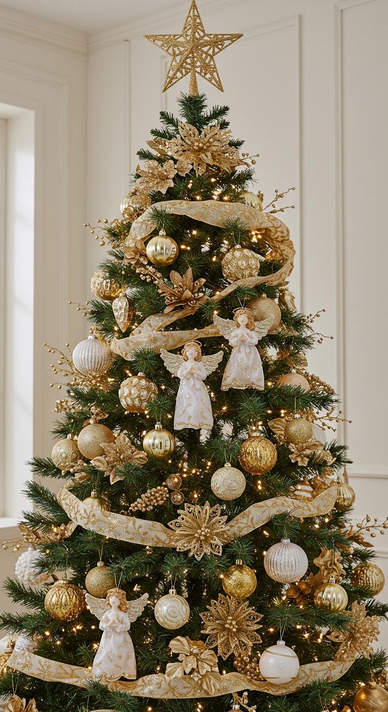 Adorn your Christmas tree with these enchanting festive ornament styles that blend opulent gold and white textures. From shimmering baubles to delicate snowflakes, each piece captures a luxurious charm.