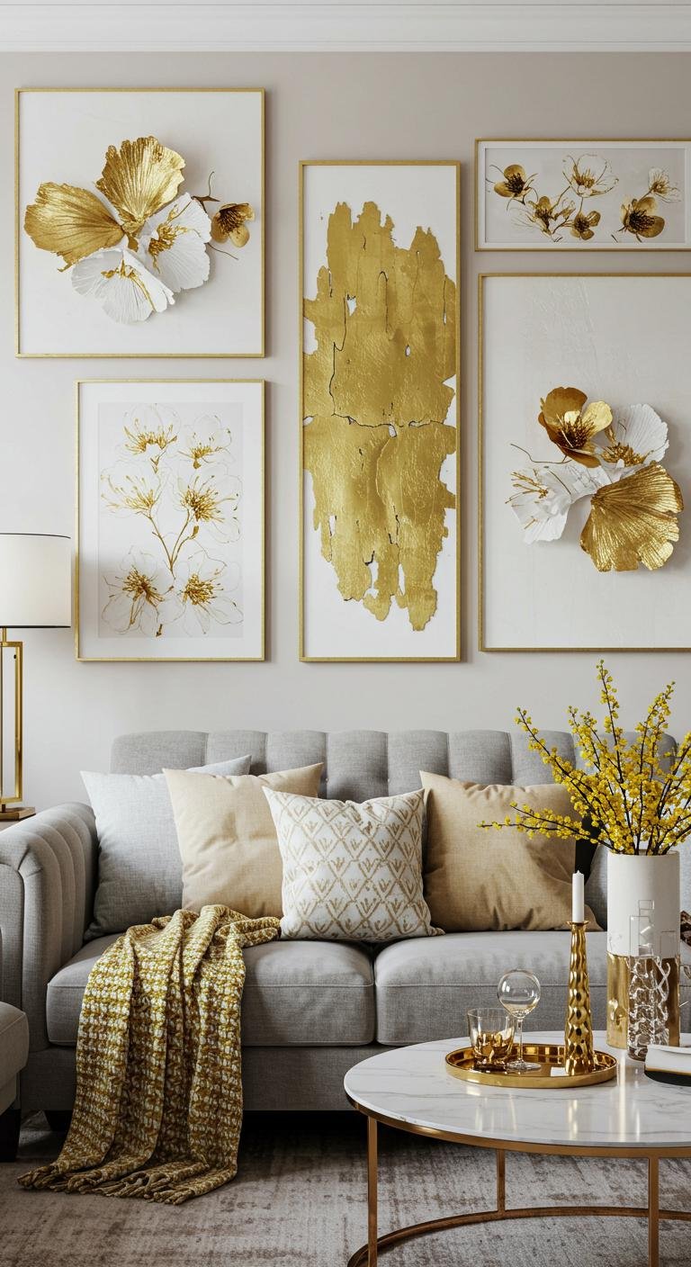 Incorporating stylish gold and white wall art can elevate your holiday decor, enhancing the theme you’ve established with luxurious pillows.
