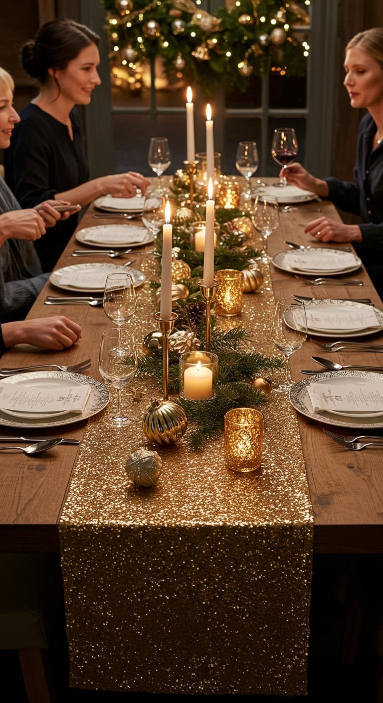 Transform your holiday dining experience with a stunning gold metallic table runner that radiates elegance.