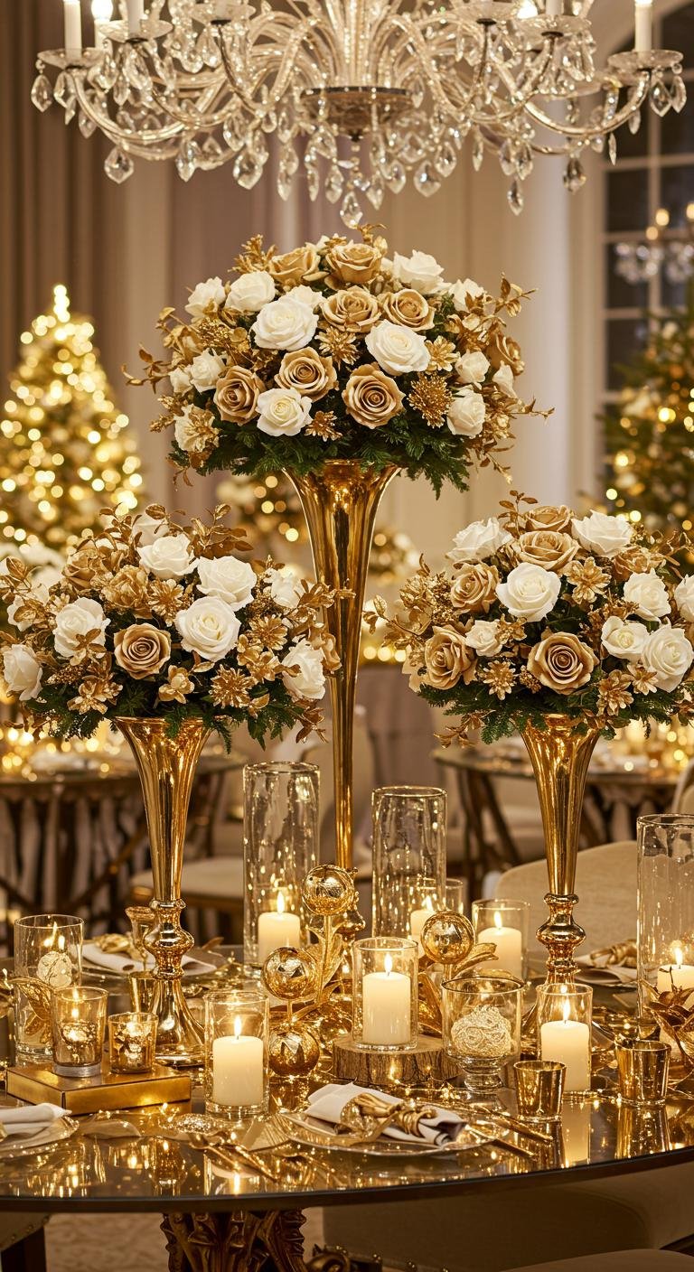 Gold and white arrangements elevate your holiday decor, blending elegance with warmth.