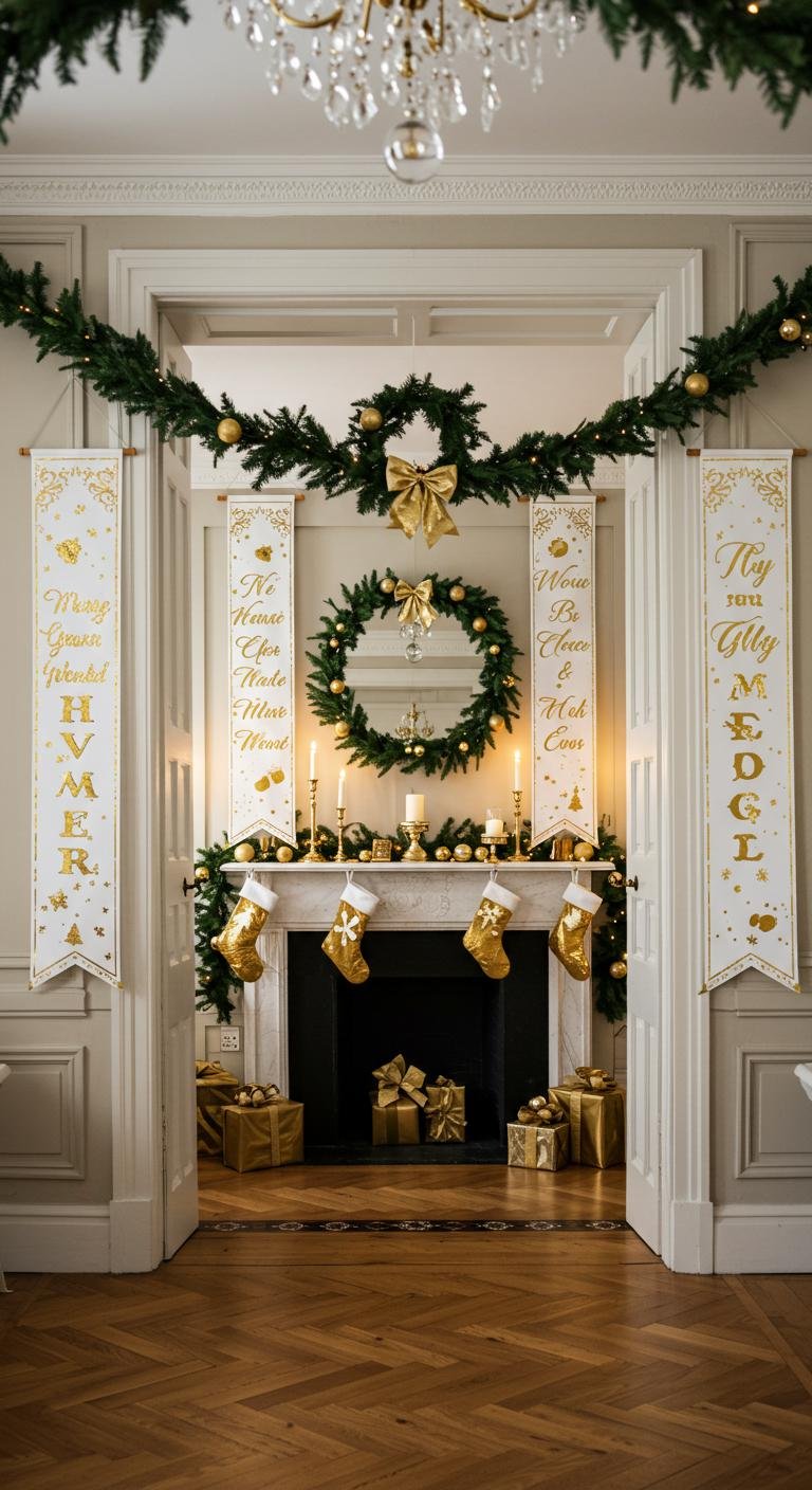 As you curate the perfect holiday atmosphere, consider adding white and gold seasonal banners that effortlessly blend elegance and festive cheer.