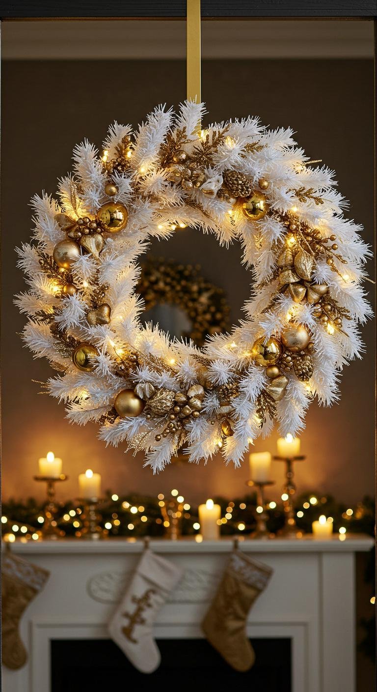 Elevate your holiday ambiance with stunning white and gold wreaths that encapsulate festive elegance.