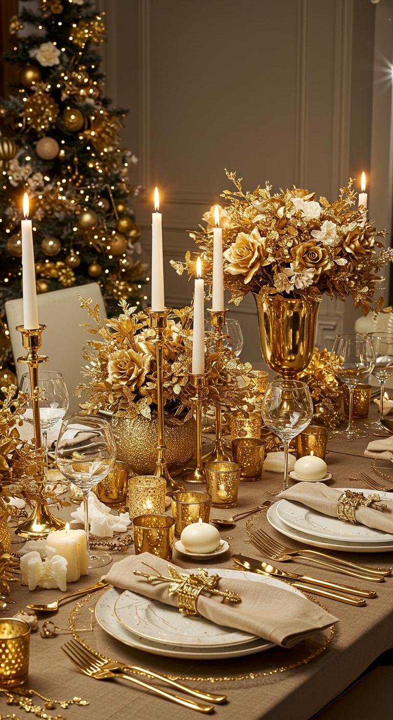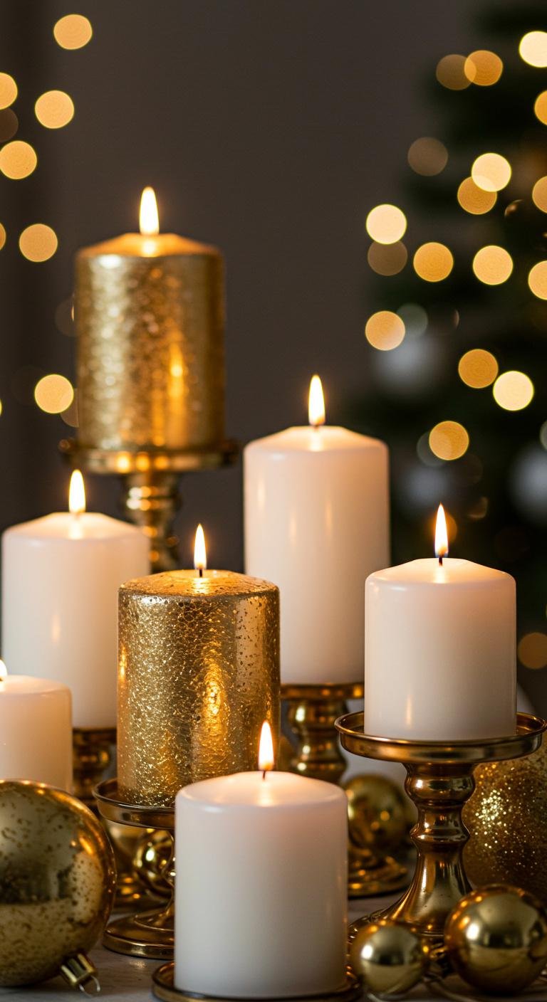Transform your holiday setting with shimmering gold and white candles that exude a sense of warmth and luxury.