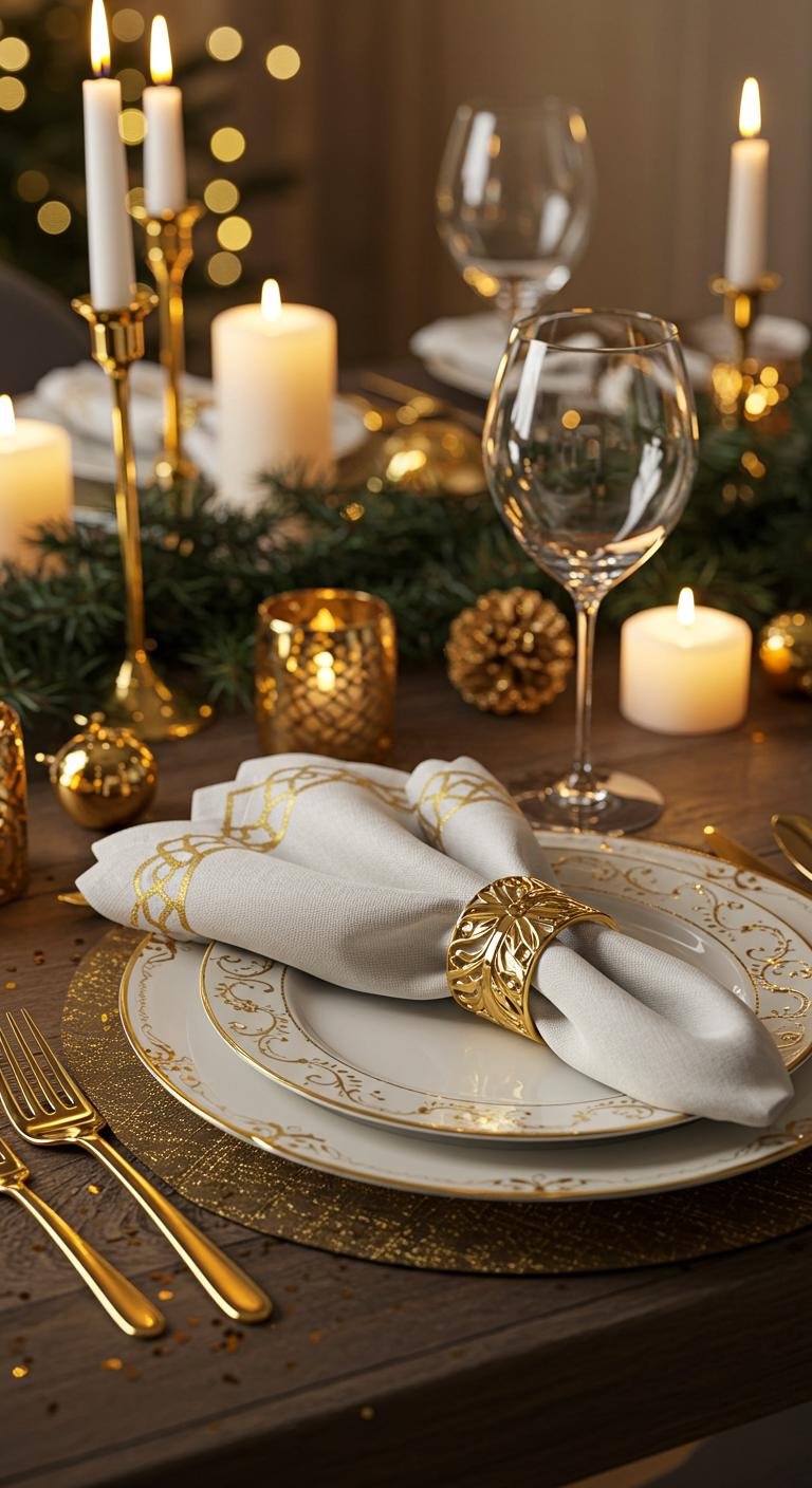 Embrace the charm of the season with chic gold and white serviettes that enhance your holiday table setting.