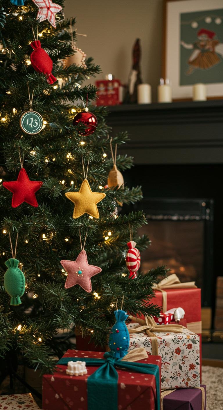Explore DIY ornament ideas using vibrant felt and simple patterns. Try creating shapes like stars or candy canes to add whimsy.