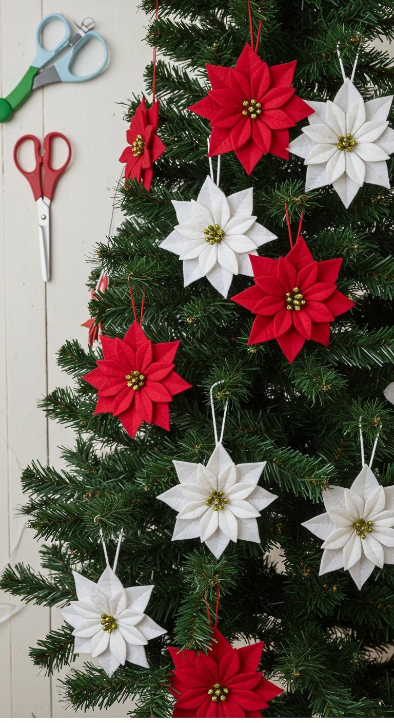 For an engaging poinsettia ornament DIY, gather felt, scissors, and thread, and let your imagination blossom as you craft these festive decorations!