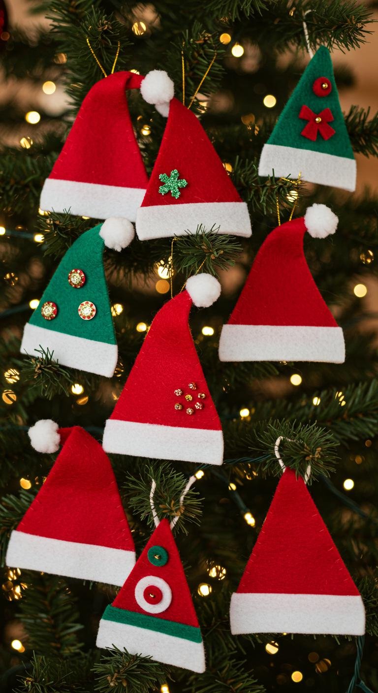 While you decorate your Christmas tree, don’t forget to include delightful Santa hat ornaments that bring a playful and festive touch to your holiday décor. These charming decorations feature simple yet creative santa hat designs, easily crafted using basic felt ornament techniques. Experiment with colors and embellishments to make each one unique, adding a whimsical sparkle to your festive atmosphere.