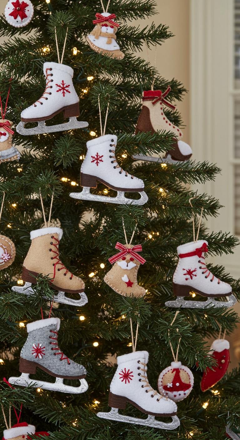 Handmade felt ice skates, featuring whimsical designs, create a cozy, nostalgic vibe. You can customize these charming ornaments with ribbons or embellishments, showcasing your personal style while capturing the essence of winter fun.