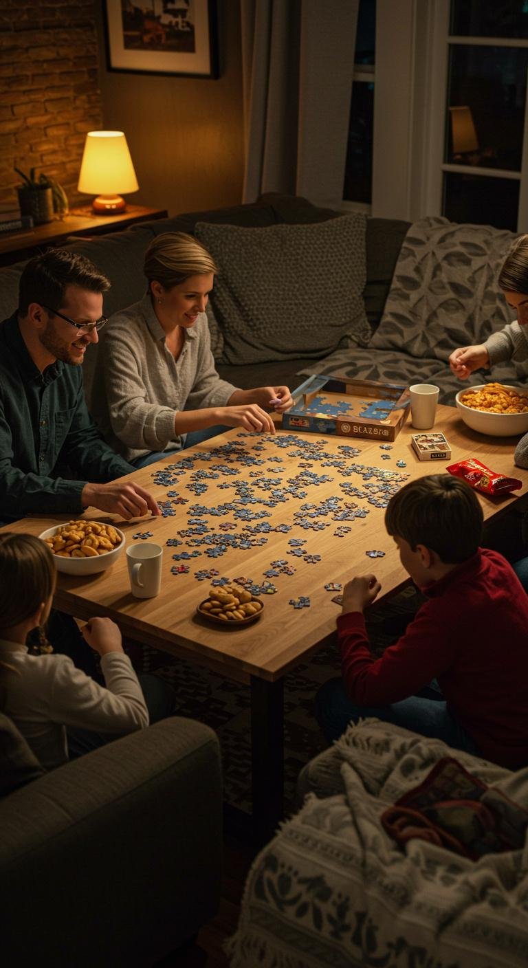 Set the stage for a themed puzzle night using a favorite family photo or a theme everyone loves. Whether you buy a puzzle or make a custom one, the key is to spread out those pieces, pour some drinks, and share some snacks. It’s all about teamwork, chatty moments, and those satisfying clicks when a piece fits just right. If you’re on a budget, thrift shops are puzzle goldmines waiting to bring everyone together.