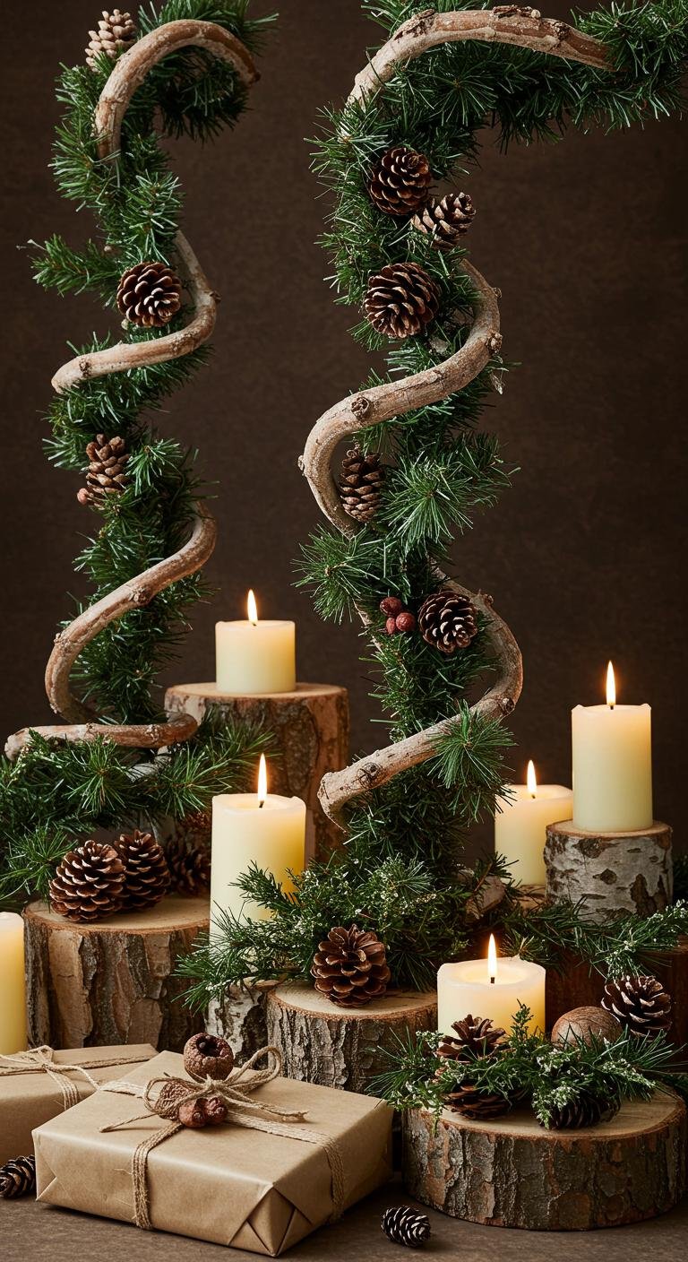 Picture swirling garlands adorned with rough-hewn wood accents and charming pinecone crafts, showcasing nature’s beauty.