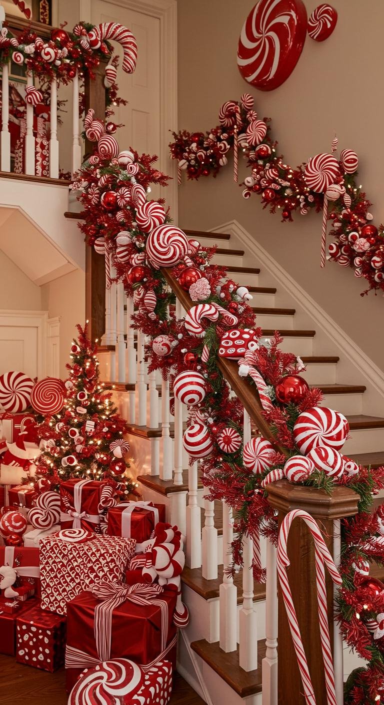 Imagine vibrant reds and whites blending in a peppermint color scheme, with candy cane crafts adorning your staircase.