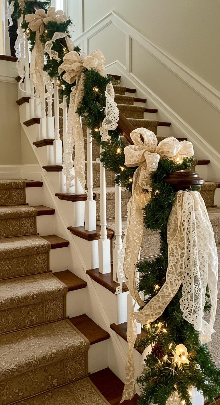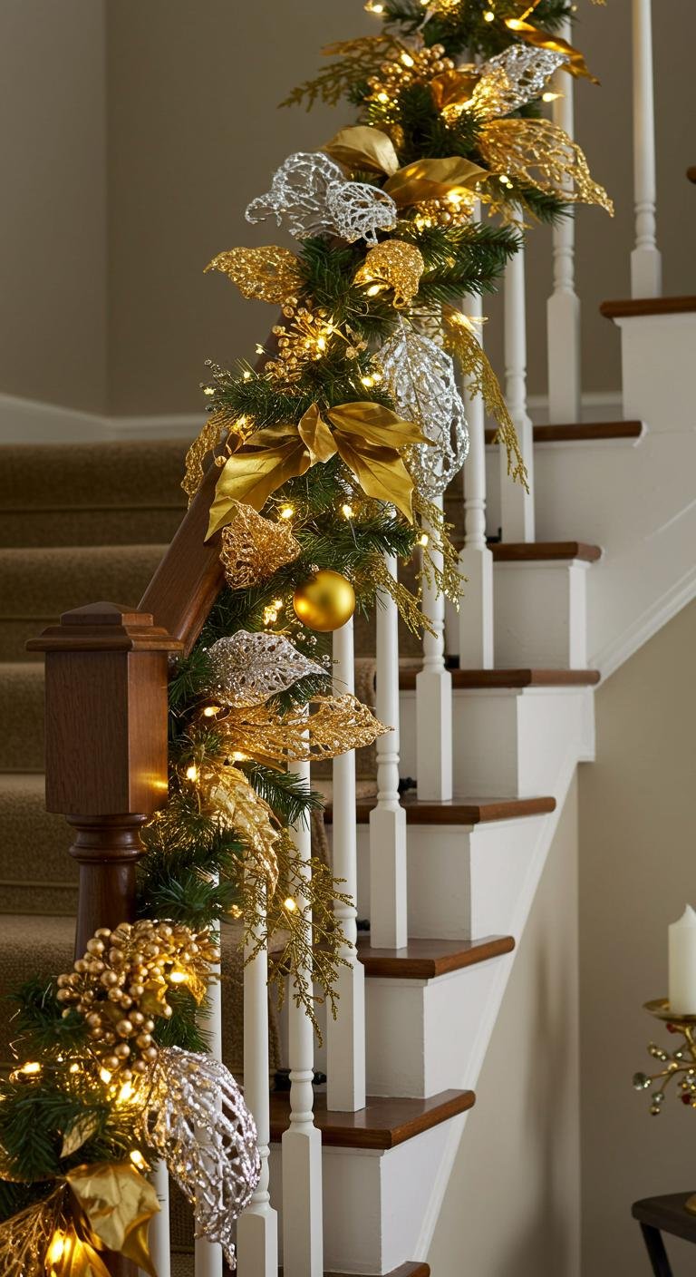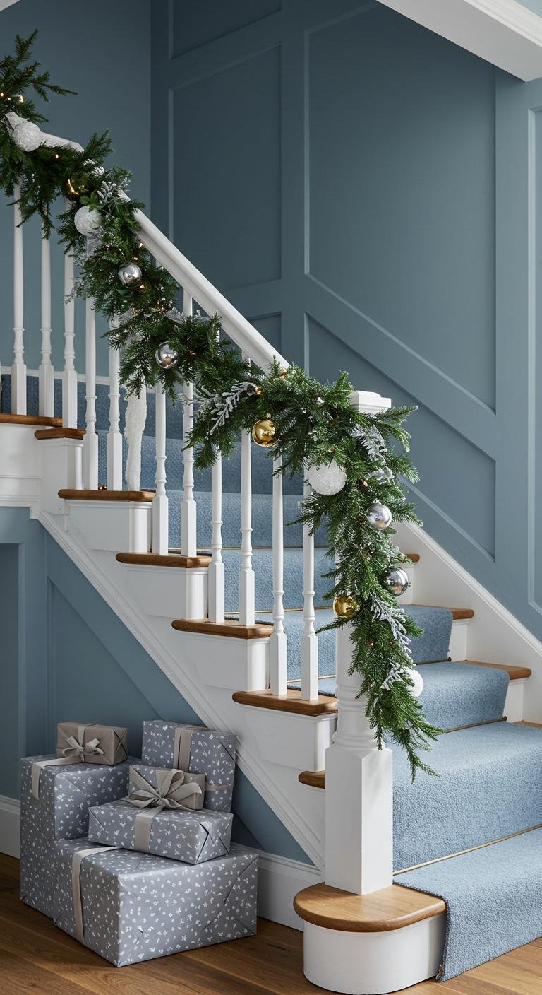 This chic arrangement invites a sense of peace, turning your staircase into an enchanting holiday pathway.