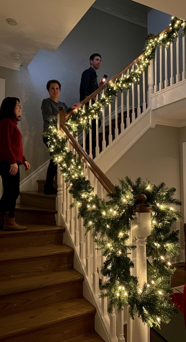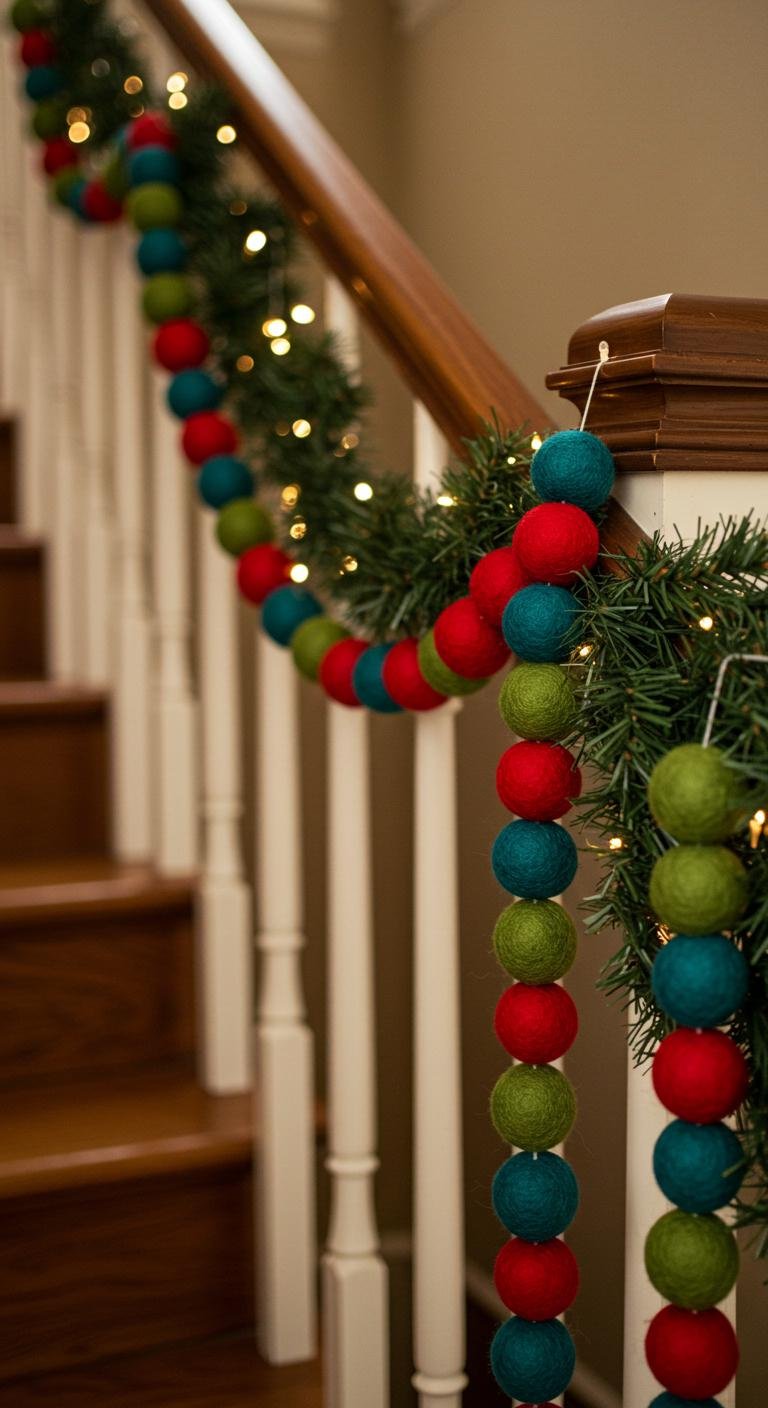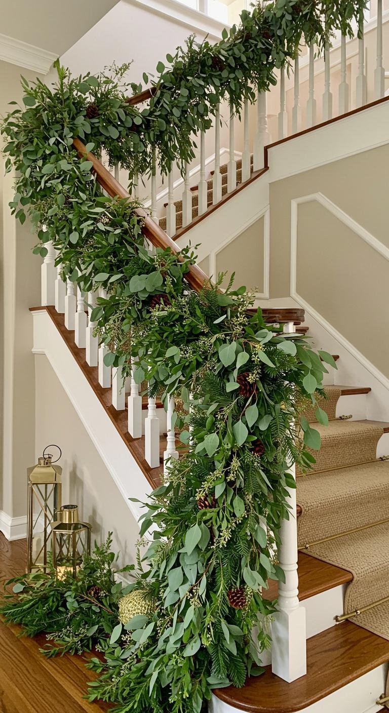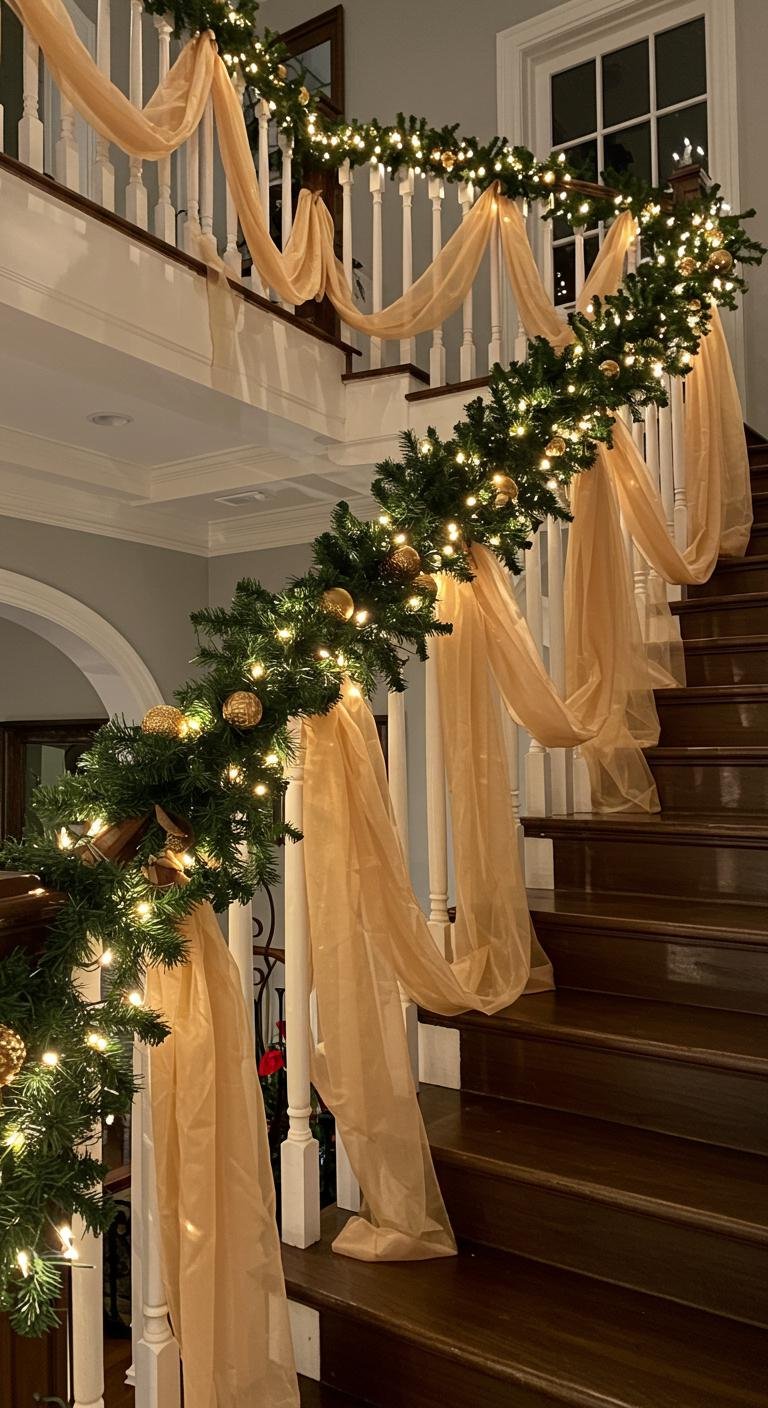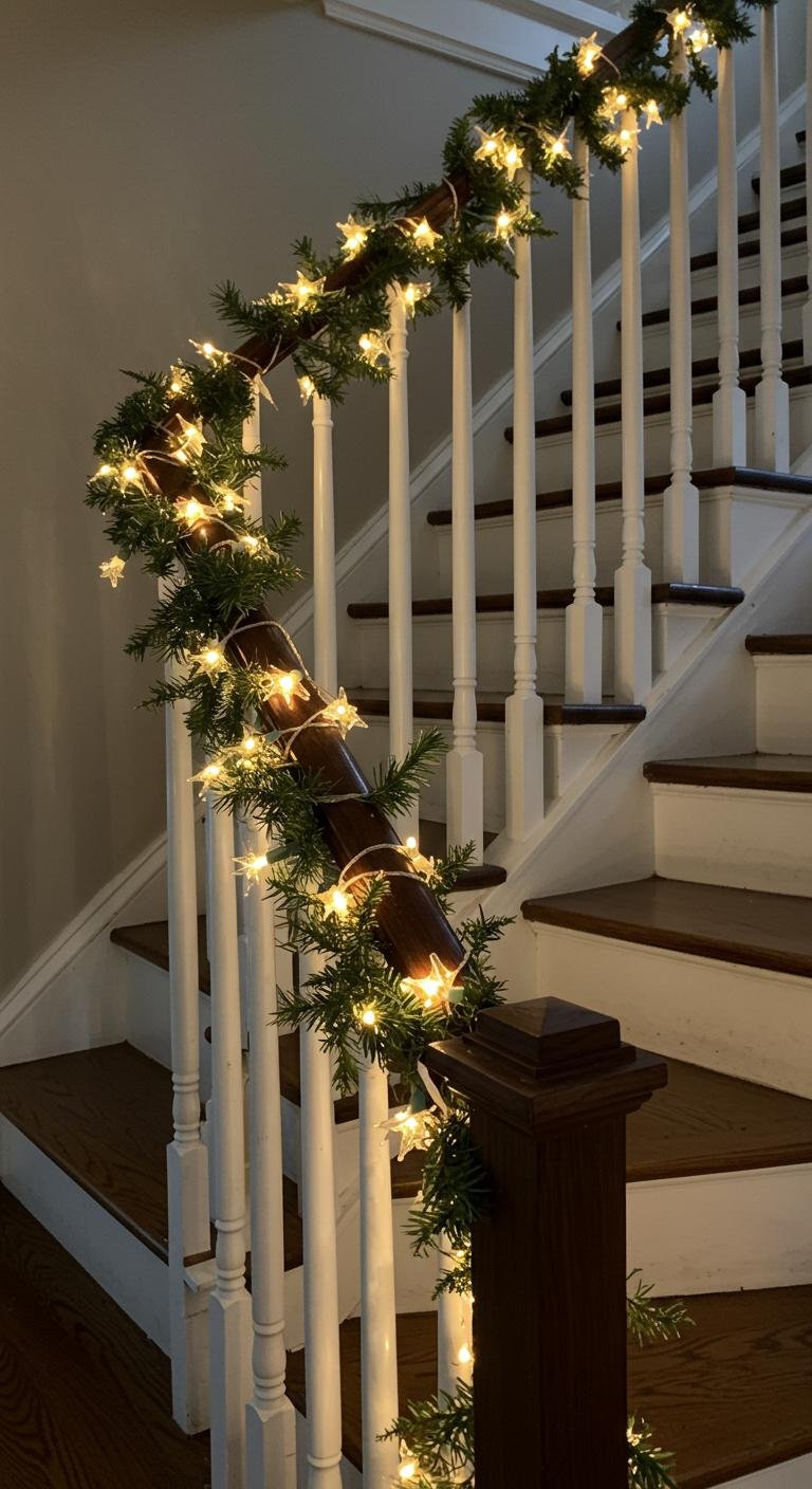 Imagine draping soft, earthy strands down your staircase, complemented by twinkling fairy lights. This combination creates a warm ambiance that invites relaxation and joy.