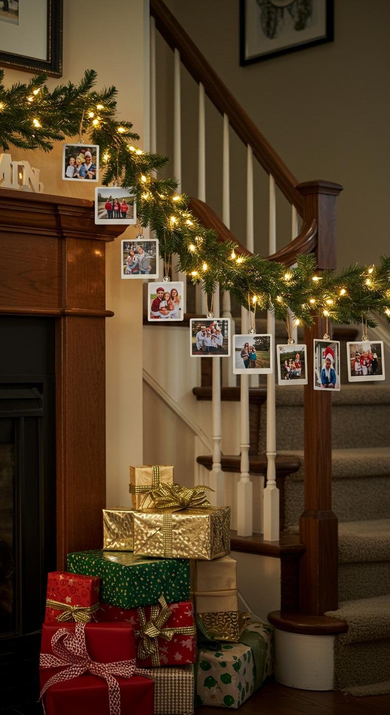 Imagine hanging custom photo ornaments, each capturing a cherished family memory. These unique decorations not only beautify your garland, but also spark joy as you stroll down the staircase.