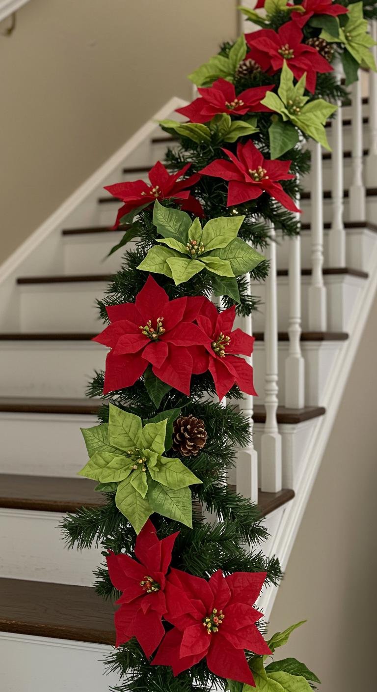 Consider incorporating beautiful poinsettia arrangements in your floral garland ideas. Cluster them along the banister, where they’ll invite cheer and warmth.