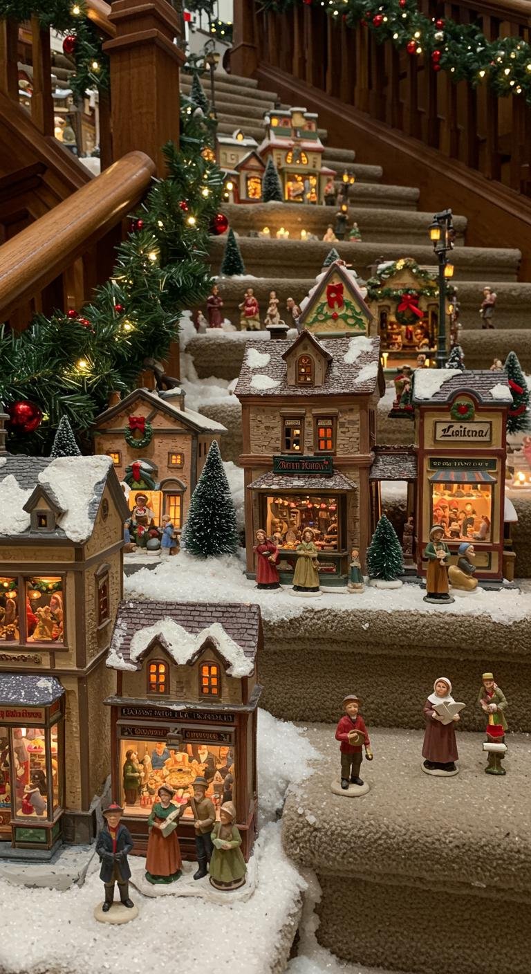 Create a charming holiday scene with a delightful village of miniatures that captures the essence of festive spirit. Picture snow-dusted rooftops and twinkling lights illuminating quaint shops filled with miniature figurines. Arrange your village display along the staircase, weaving garlands of greenery with small ornaments to enhance the warmth. This enchanting setup invites all who pass to embrace the joy of the season.