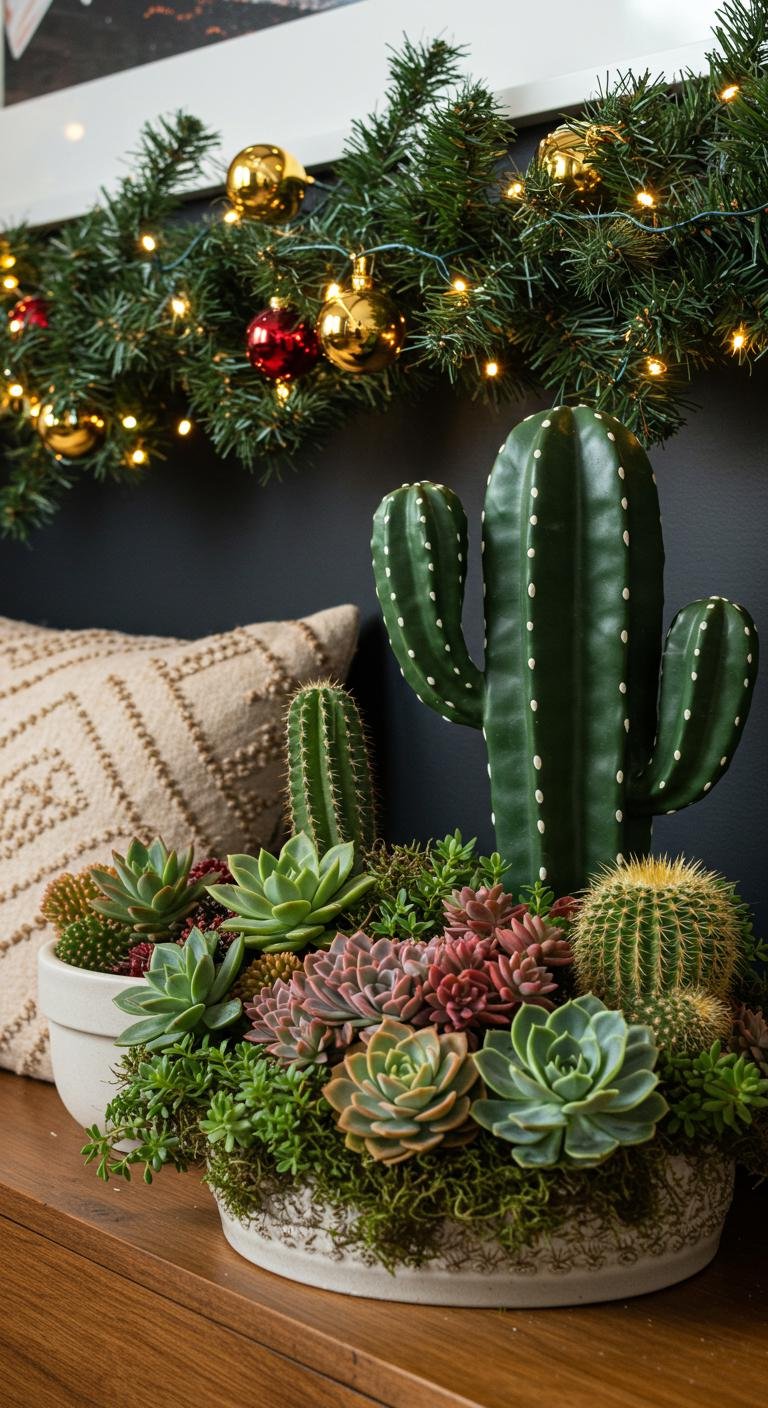 Picture vibrant succulent arrangements nestled alongside twinkling lights, or bold cactus displays showcasing their unique shapes.