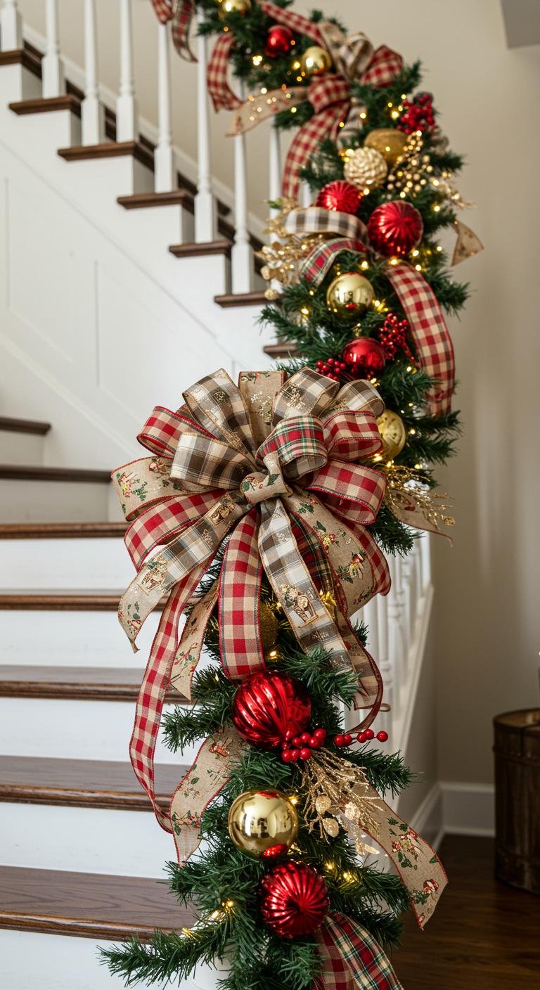 These delightful plaid patterns bring a rustic yet festive vibe to your staircase.