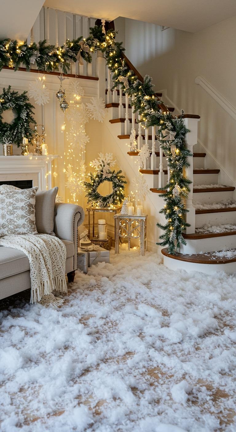 Drape your staircase with shimmering garlands, then sprinkle delicate fake snowflakes to create a stunning visual.