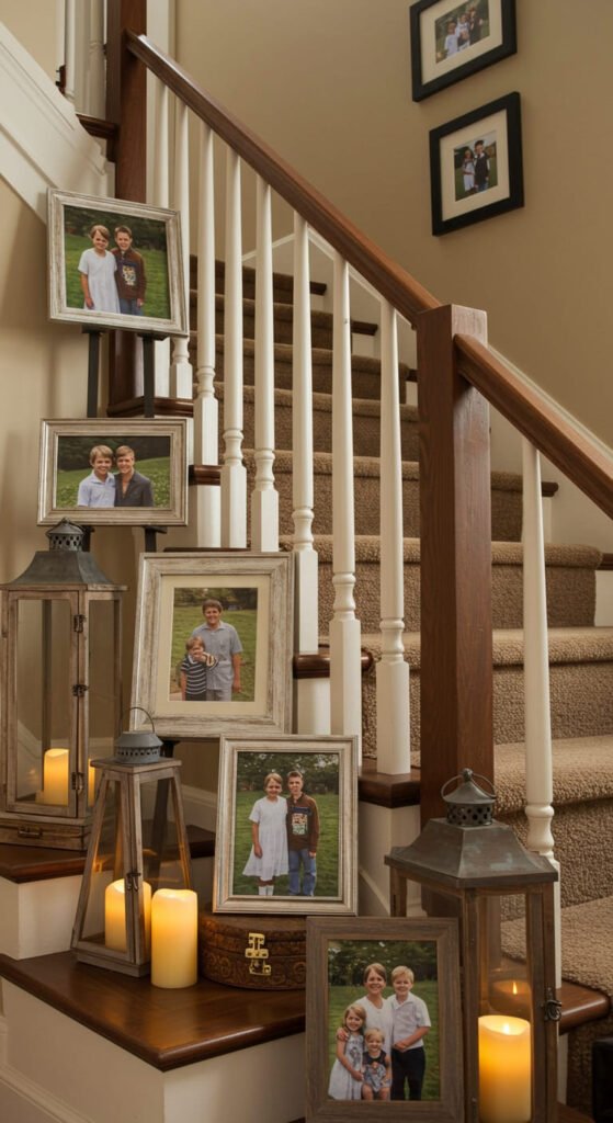 Candle lanterns may illuminate your staircase beautifully, but personal touches like personalized photo frames truly make the space feel like home.