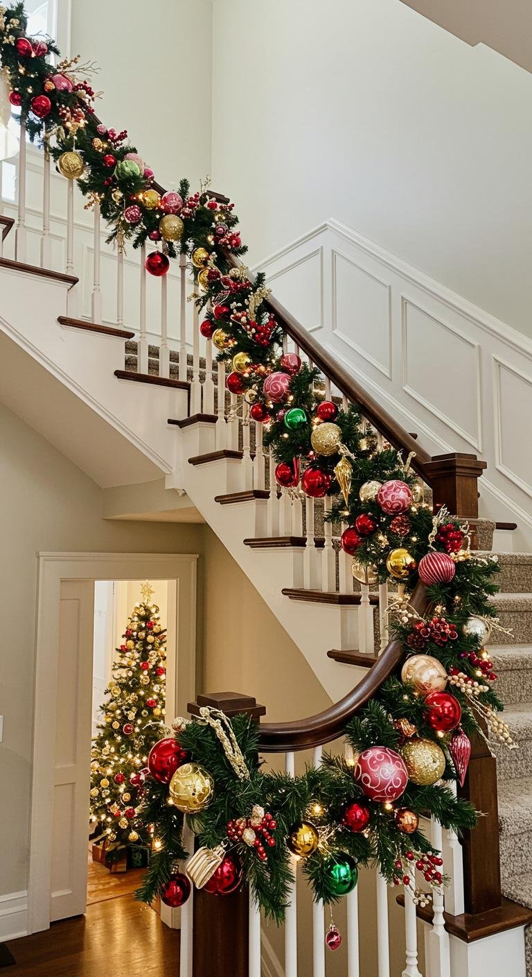 Drape shiny garlands shimmering with gold and silver hues along the banister, while strategically placing metallic ornaments that catch the light.
