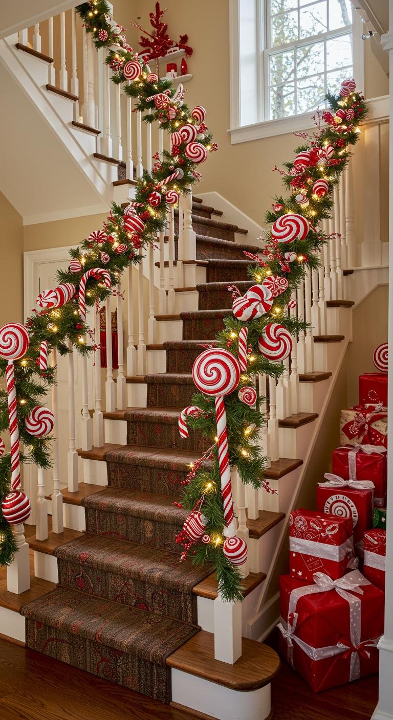 Twinkling with festive cheer, whimsical candy cane details can transform your staircase into a playful holiday spectacle.