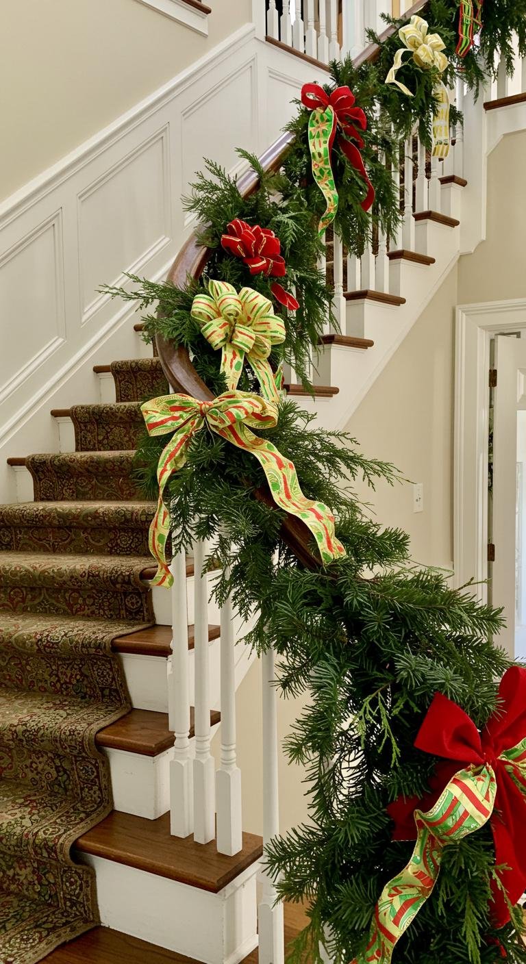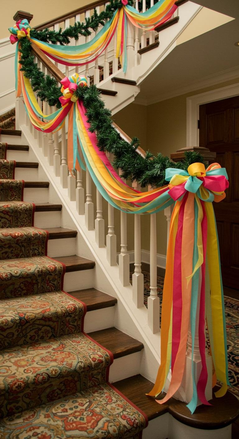 Adding colorful ribbons and bows to your staircase elevates the festive spirit and creates an inviting atmosphere.