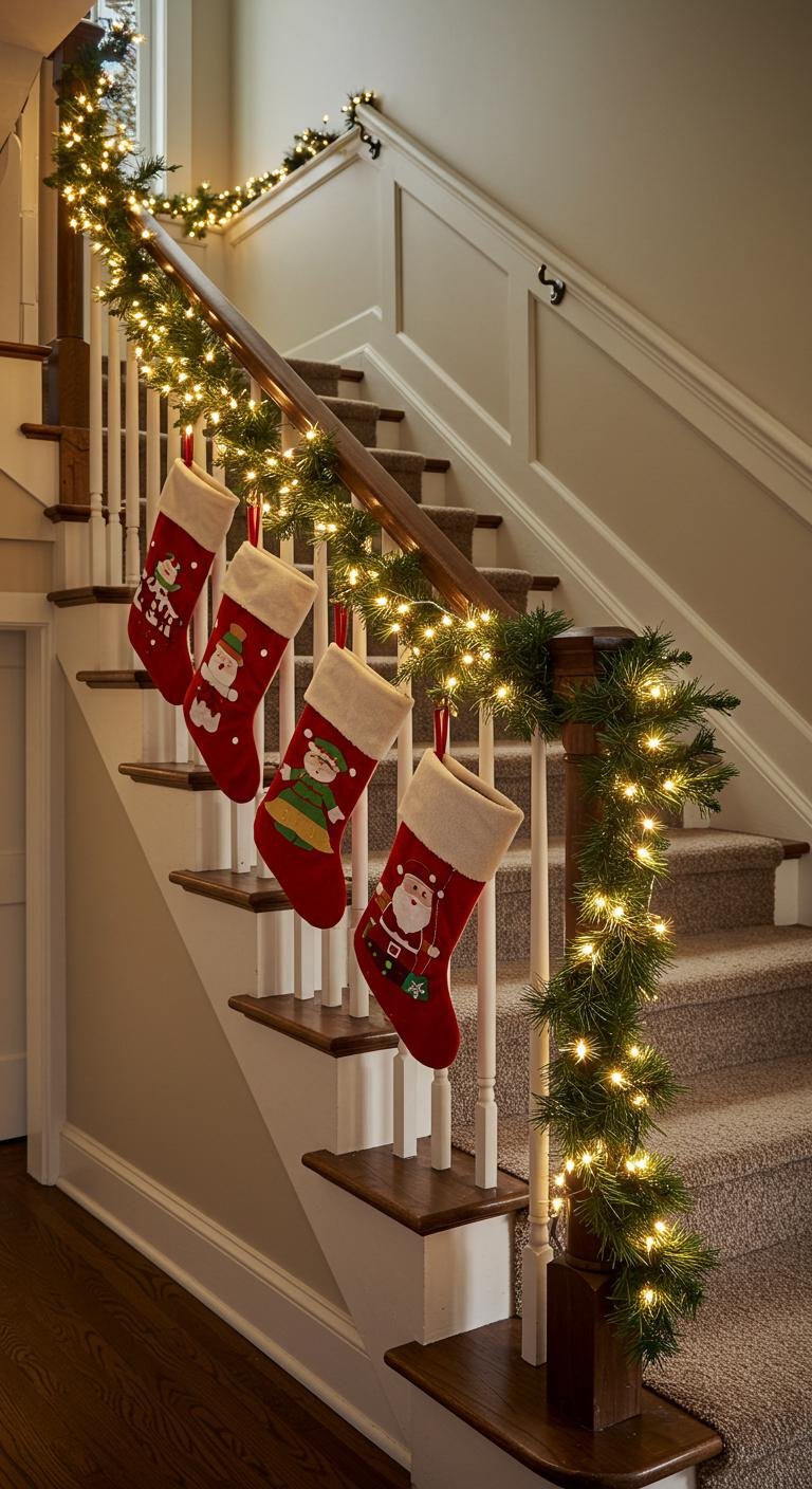 As you complete your whimsical stocking display, consider the enchanting allure of twinkling string lights to elevate your staircase decor.