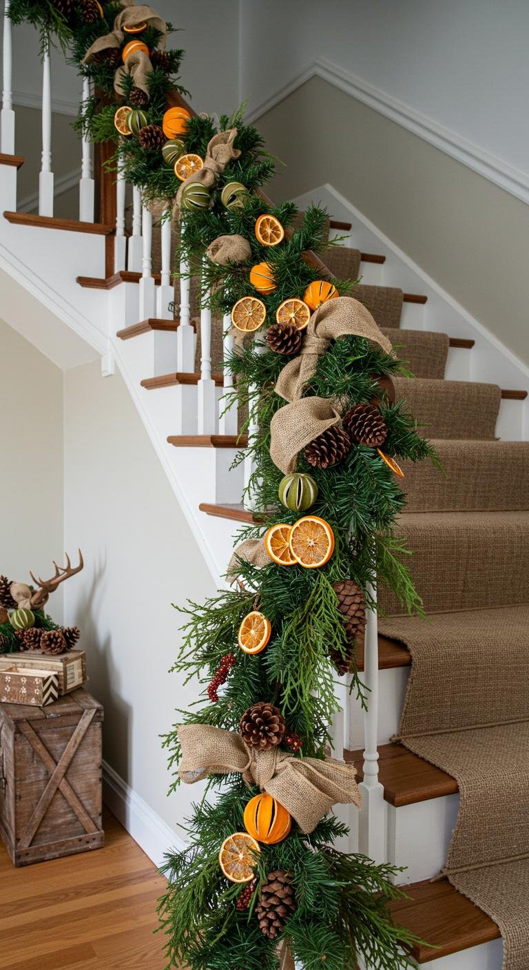 Adorn your staircase with vibrant dried orange slices interspersed with fragrant cinnamon sticks, creating an inviting aroma. Use twine to hang these beauties, allowing guests to appreciate each detail.