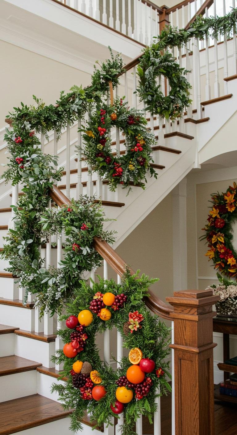 Adorn your staircase with nature-themed accents like pinecones and dried citrus slices, while draping it in garlands made from fresh greenery.