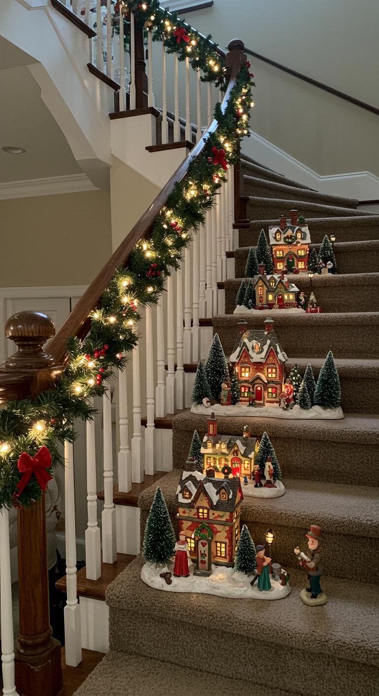 Arrange your village layout with twinkling lights and festive figurines, carefully placed along the banister and on each step.