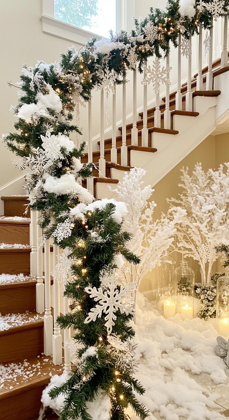 As you continue to enhance your staircase decor, consider the enchanting effect of frosted faux snow decor.