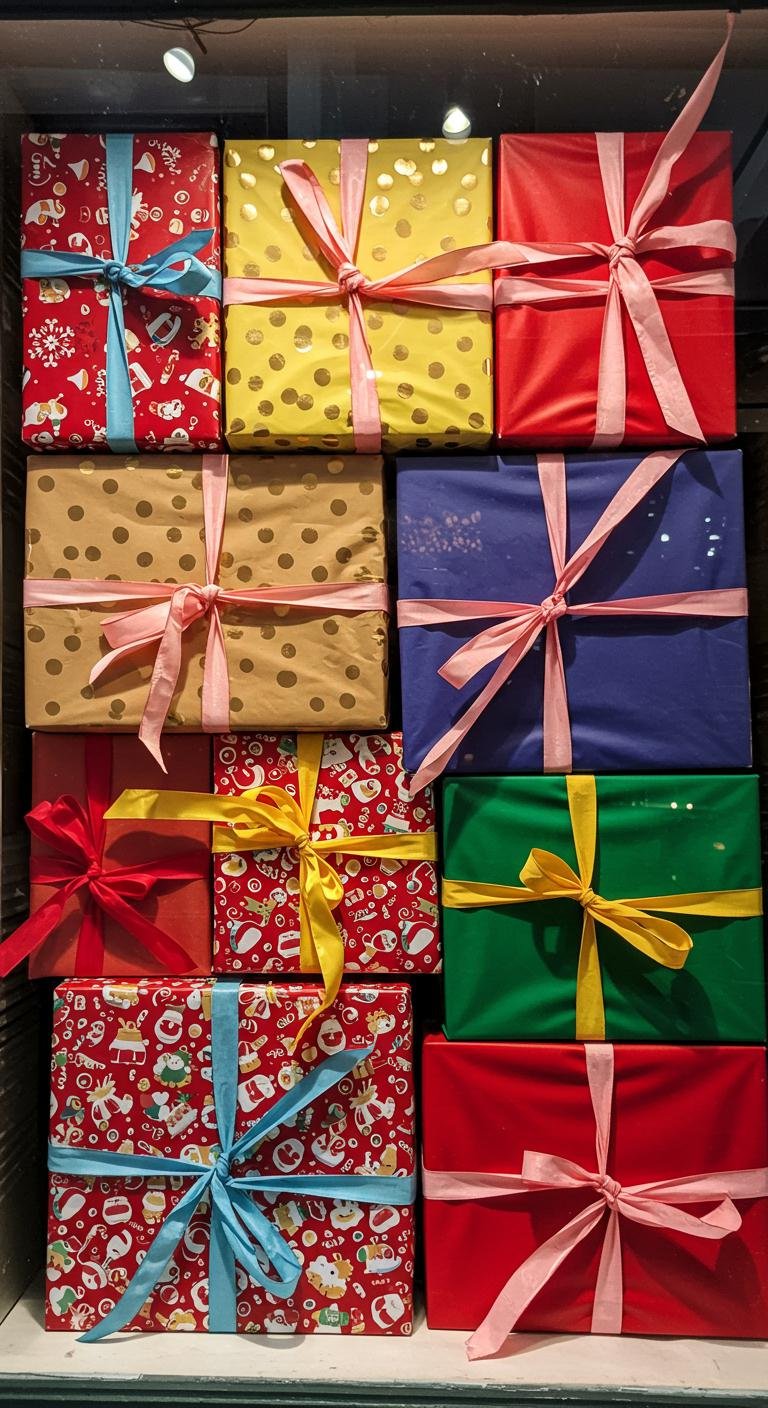 Add a splash of color to your holiday window with vibrant gift wrap displays that instantly capture attention and evoke the joy of the season.