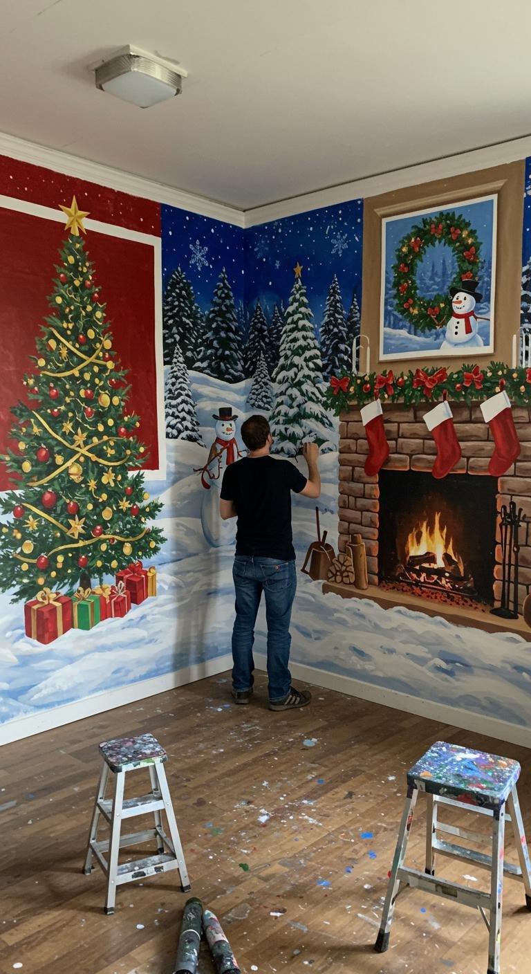 Use enchanting holiday mural techniques, like stencils or freehand painting, to showcase joyful scenes.