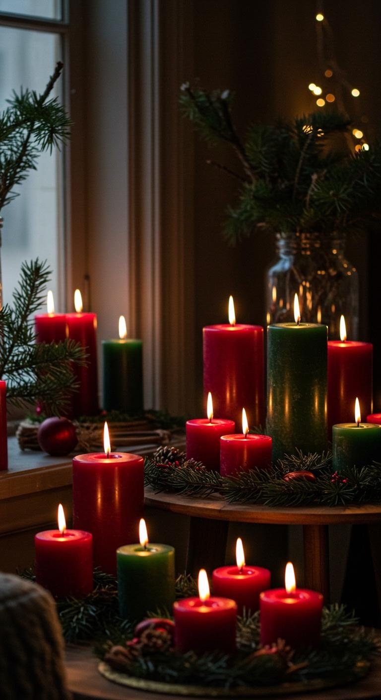 Choose rich candle colors like deep red or emerald green, and mix scent combinations like cinnamon and pine for a festive touch.