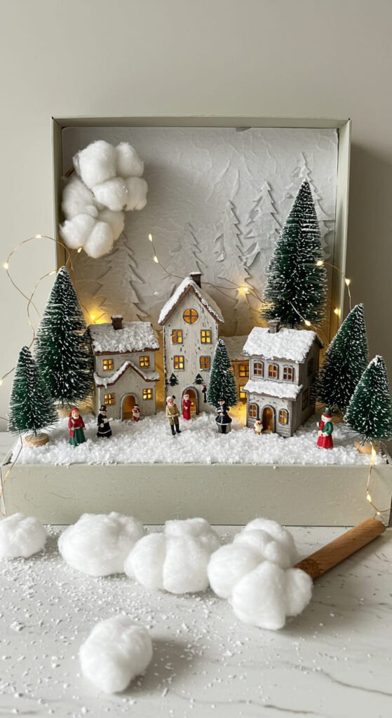 Gather materials like cotton balls, sugar, or white spray paint to mimic snow. Use small boxes or jars to craft your own miniature villages.