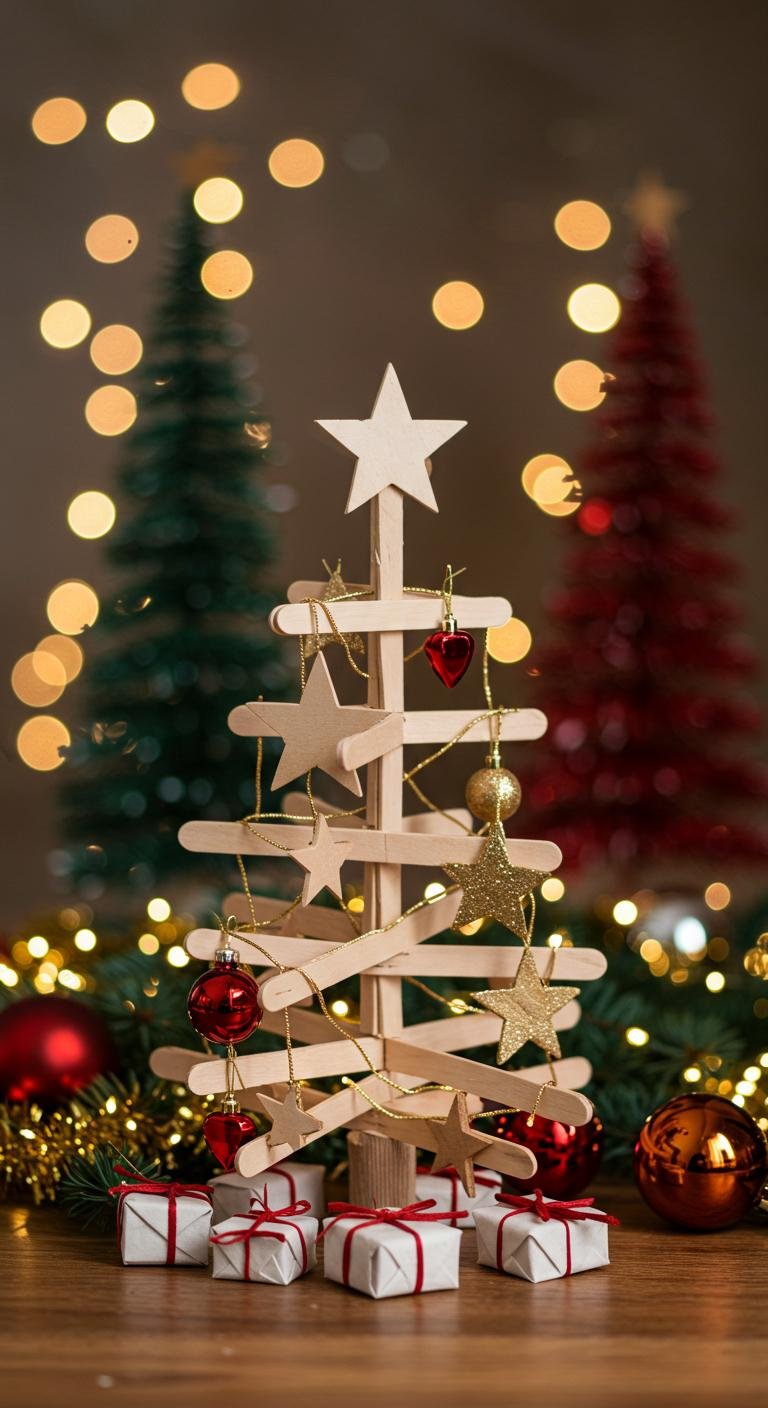 Crafting a Popsicle Stick Christmas Tree is a delightful way to bring some holiday spirit into your home. You can glue popsicle sticks together to form a tree shape, then decorate it with popsicle stick ornaments like stars or garlands. Once finished, place your creation among other holiday decorations. This craft’s not only fun but adds a personal touch to your festive ambiance!